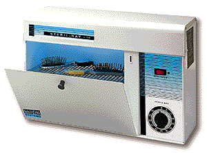For busy shops. Ultraviolet rays from two GTL3 bulbs and warm air sanitize and dry automatically. Timer signals completed cycle. Operates with or without heated air.