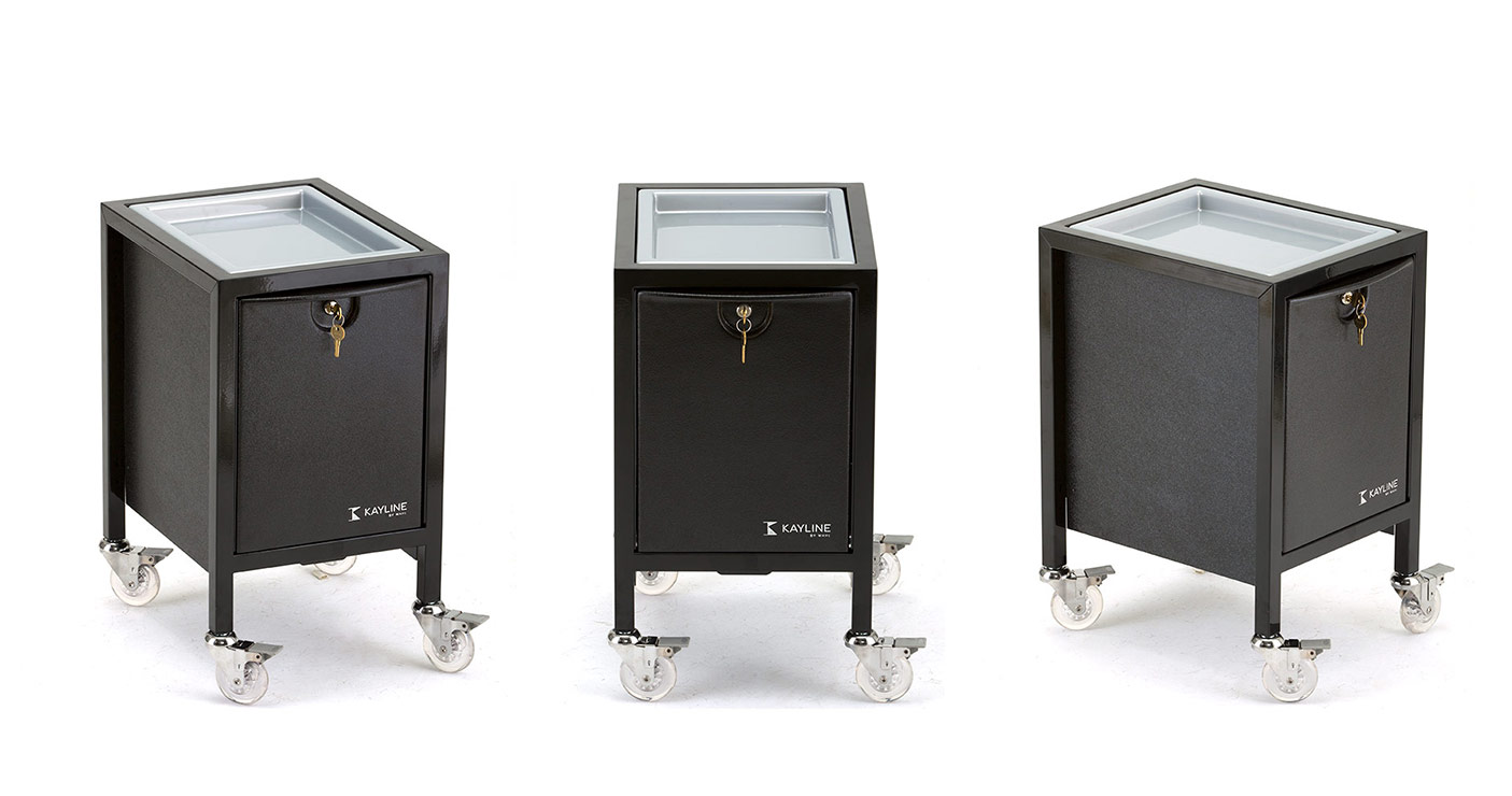 The Mini (SK-23-CB-BLK) is Skate Kart innovation in a smaller, space-saving package. Elegant design, built in the U.S.A. to last. Powdercoat-finish welded steel, high density polystyrene and quality locking skate wheels. Crystal Black frame with Black plastic. Features removable top, two trays with fold away door with keyed lock, optional side and rear baskets. All Kayline salon pedicure storage carts are made in Long Beach, California.