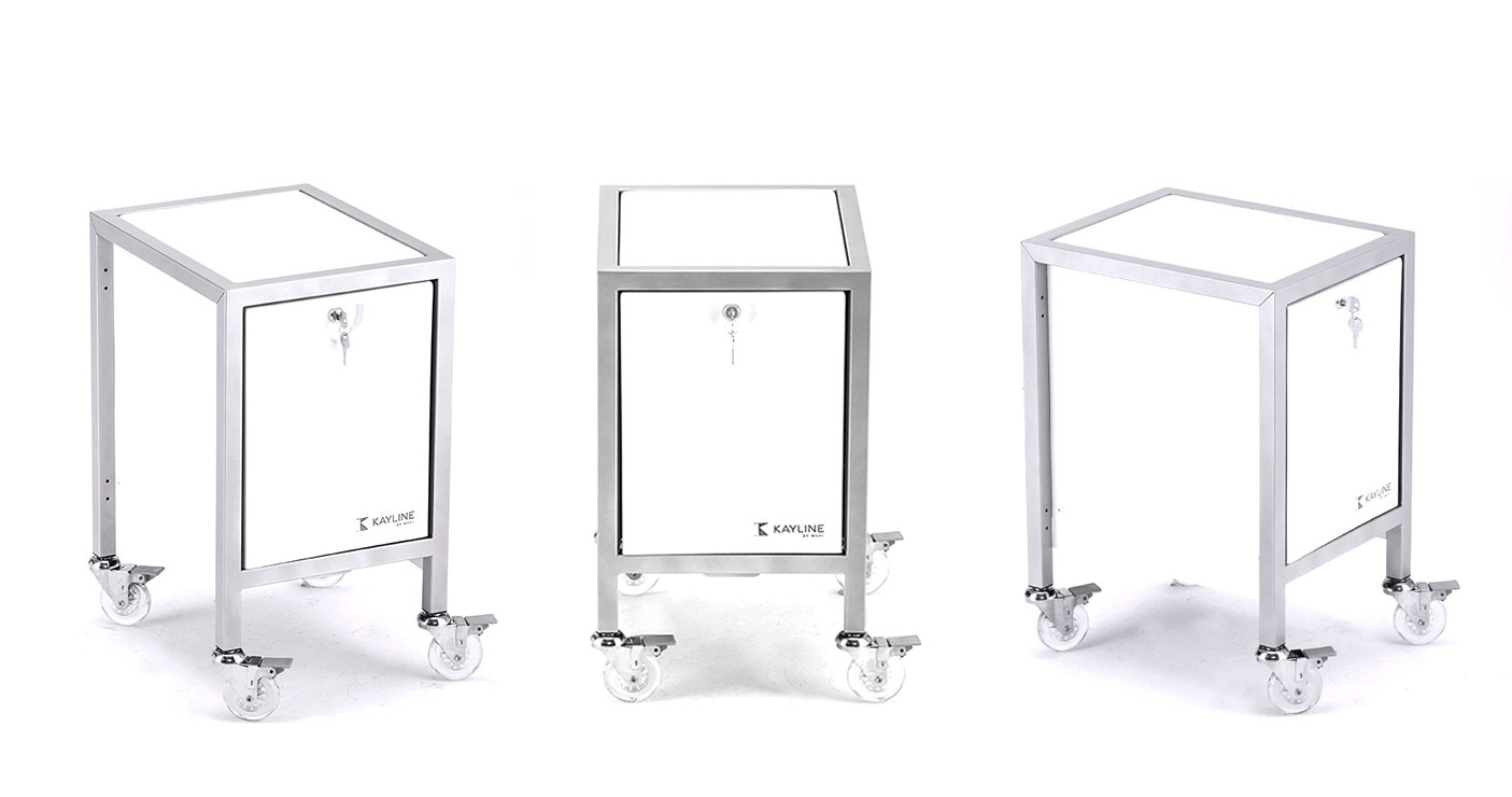 The Mini (SK-23-CW-SIL) is Skate Kart innovation in a smaller, space-saving package. Elegant design, built in the U.S.A. to last. Powdercoat-finish welded steel, high density polystyrene and quality locking skate wheels. Silver frame with Crystal White plastic. Features removable top, two trays with fold away door with keyed lock, optional side and rear baskets. All Kayline salon pedicure storage carts are made in Long Beach, California.