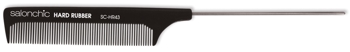 # SC-HR43 8.5" Pin Tail Comb Size: 8-1/2" Long X 15/16" Tall X 3/16" Thick All Half Fine Teeth * Teeth area is 3-3/4" long with a Slight Arch in back Stainless Steel Pin Tail is 4-1/2" Long 100% Genuine Hard Rubber High Heat Resistant Professional Strength and Durability Gental on Hair and Scalp Made in India Color: Black ** Compare to the discontinued Champion 43 Pin Tail comb ** |