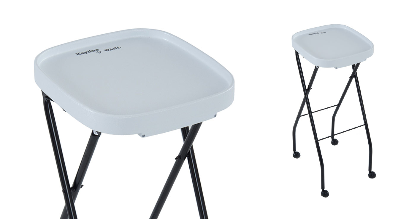 Convenient fold up salon color tray is great for weaving, perms, hair extensions, and styling 14" x 15" work surface with a fixed height of 35". Simple tray lock release for tilting tray up into storage position. Folds up flat to 47"H for compact storage.